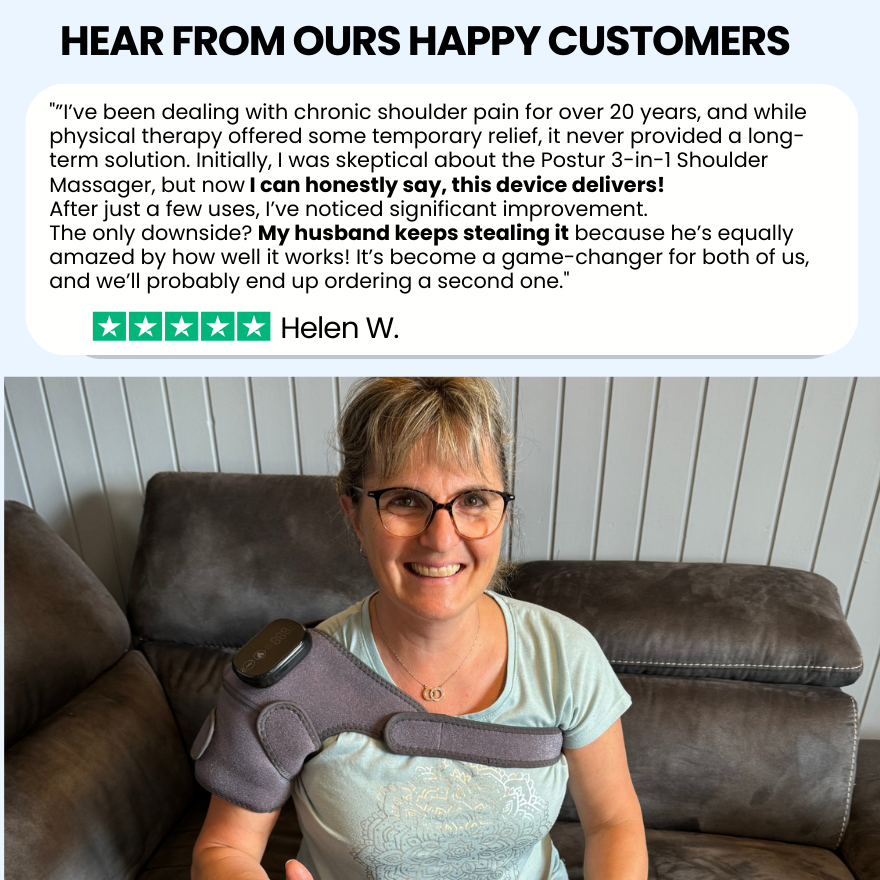 After receiving my Postur 3-in-1 Shoulder Massager, I couldn’t wait to try it out. It’s honestly one of the best purchases I’ve ever made. I’ve got severe shoulder problems and can’t undergo surgery due to other health issues. But with just 15 minutes of using this massager, I felt so much better! I went out shopping afterward and had no pain at all. Thank God for this miracle device—it’s really helped me enjoy life again. I’ve recommended it to several friends, and they’ve already placed their orders. Thank you, Postur!